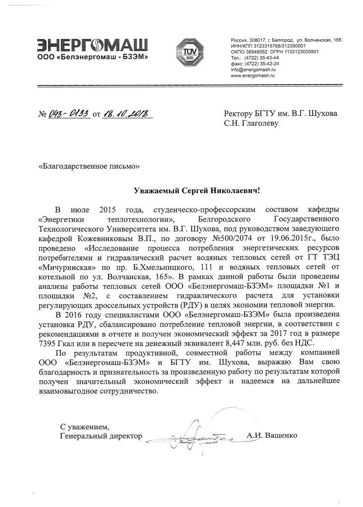 Учёные института энергетики, информационных технологий и управляющих систем БГТУ им. В.Г. Шухова принимают активное участие в разработке мер, повышающих энергетическую эффективность систем теплоснабжения муниципальных образований. В частности, в июле 2015 года студенческо - профессорским составом кафедры энергетики теплотехнологии Института под руководством заведующего кафедрой В.П. Кожевникова было проведено исследование процесса потребления энергоресурсов и гидравлический расчёт водяных тепловых сетей города Белгорода от ТЭЦ "Мичуринская" и котельной по ул. Волчанская. Выполненные работы и сформулированные рекомендации позволили повысить энергоэффективность тепловых сетей города.